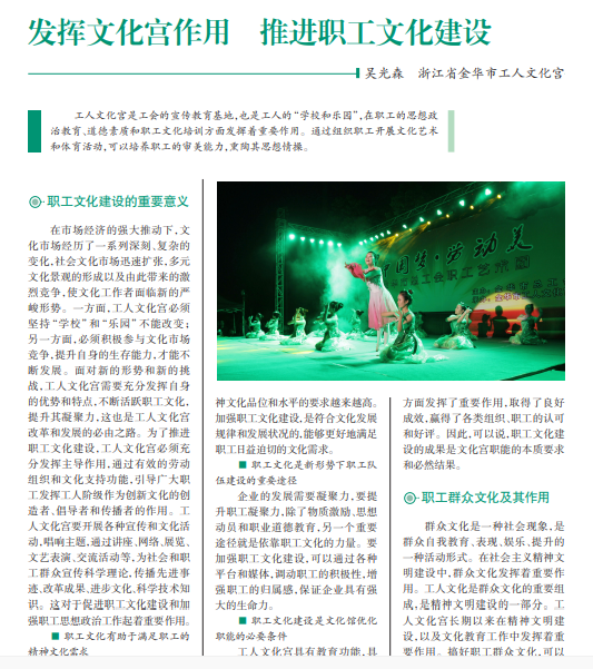 工人文化宫是工会的宣传教育基地,也是工人的“学校和乐园”,在职工的思想政 治教育、道德素质和职工文化培训方面发挥着重要作用。通过组织职工开展文化艺术 和体育活动,可以培养职工的审美能力,熏陶其思想情操。