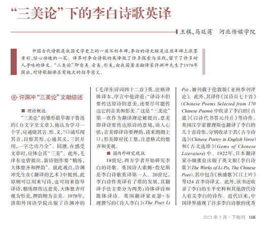 中国古代诗歌是我国文学史上的一座不朽丰碑,李白的诗无疑是这座丰碑上浓墨 重彩、惊心动魄的一笔。译界对李白诗歌的英译做了许多探索与实践,留下了许多耐 人寻味的译文。“三美论”即意美、音美、形美,由我国著名翻译家许渊冲先生于1978年 提出,对诗歌翻译具有极大的指导意义。