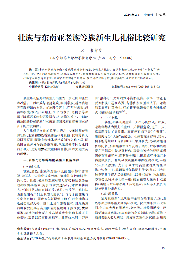 中国的壮族与东南亚老族等族有亲缘关系,在新生儿礼俗上有很多相似之处,如都有“三朝礼”“满