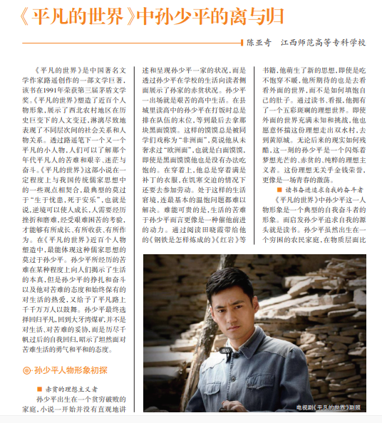 孙少平是《平凡的世界》中的核心人物之一,要全面理解孙少平这一人物 形象,可以抓住“离”与“归”这对矛盾,围绕理想主义、自我奋斗、爱情悲剧这几 个关键词深入剖析。