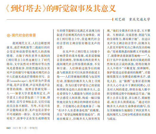 《到灯塔去》是英国著 名现代主义小说家弗吉尼 亚·伍尔芙创作的长篇小说, 体现了鲜明的现代主义创作 观,是作者在思想上和艺术 上都相当成熟的一部经典作 品。目前,国内外听觉叙事 研究正如火如荼,国内学者 傅修延认为国外听觉叙事的 开拓之作“当属加拿大学者 梅尔巴·卡迪-基恩(Melba Cuddy-Keane)2005年发表的 论文《现代主义音景与智性 的聆听:听觉感知的叙事研 究》”,其对伍尔芙小说中的 听觉叙事研究具有启迪性。