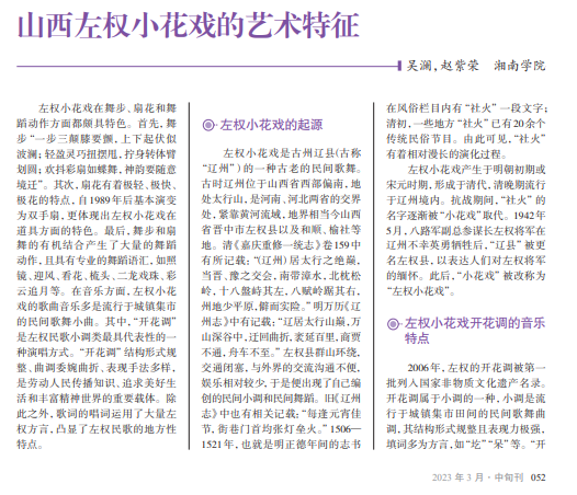 左权小花戏作为一 种流传于山西省左权县 的汉族歌舞小戏,具有独 特的艺术性。2014年 11 月,左权小花戏成功申报 为第四批国家级非物质 文化遗产。左权小花戏 作为左权县独有的地方 艺术形式,以丰富的文化 载体,记录了地方风土人 情,承载了群众的思想和 情感,彰显了地方音乐文 化的魅力。