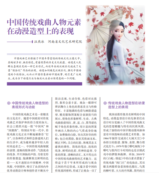 中国戏曲艺术根植于中国丰厚富饶的传统文化土壤之中, 其绚丽多彩、独具特色,有着深厚的历史文化底蕴。动漫是人民 群众喜闻乐见的一种艺术形式,而近年来的泛娱乐化造成了大 量“低俗化”作品的出现。动漫如何避免泛娱乐化、强化中国动 漫的个性特征,从而以中国形象讲好中国故事、吸引更广大观 众,成为当下动漫行业与相关从业者必须考虑的一个问题。