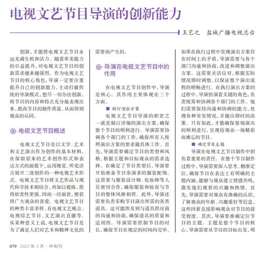 创新是发展 的 动 力。 在 电 视 文艺节目创作中, 导演的创新能力 非常重要,不仅有 助于提高节目质 量,而且能展现导 演的巧思,促进电 视节目的发展。