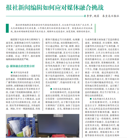 报社新闻编辑在媒体融合时代面临的挑战较多,比如数字化技术的广泛应用、多 元化新闻报道形式的发展、工作模式固化和创新意识缺乏等。要想高效应对这些挑 战,报社新闻编辑需要提升技术能力、增强职业道德意识、拓宽思路、增强创新意识。