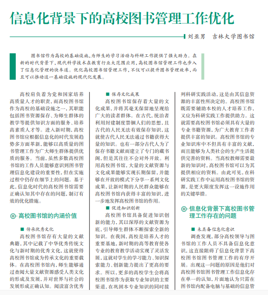 图书馆作为高校的基础设施,为师生的学习活动与科研工作提供了强大助力。在 新的时代背景下,现代科学技术在教育行业大范围应用,高校图书馆管理工作也步入 了信息化管理的快车道。优化高校图书馆管理工作,不仅可以提升图书管理效率,而 且可以推动这一基础设施的现代化发展。