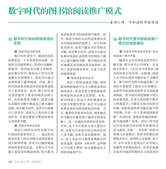 阅读是促进社会文明发展的 重要方式,也是个人成长和完善的 重要手段。随着时代的进步,人们 的阅读习惯也不断改变。随着科 技的飞速发展,数字阅读已经成为 当今社会一种重要的阅读形式。 图书馆也纷纷推出电子图书,以满 足读者的需求。为促进数字阅读 可持续发展,图书馆应积极采取措 施,加强数字化建设,吸引更多的读 者,为全民阅读打下坚实的基础。