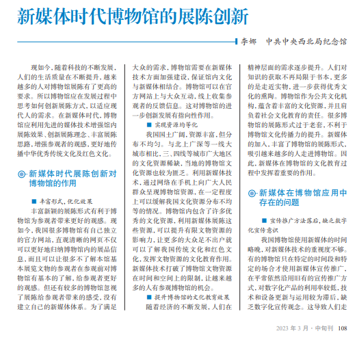 随着科技的进步,时 代也在不断发展。互联 网时代,信息的传播方式 正在发生着翻天覆地的 转变。作为城市物质文 化的储藏地,博物馆应在 新媒体时代创新发展,积 极利用新媒体的优势,增 强馆内展陈效果,增强参 观者的观感。