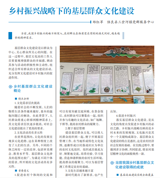 当前,我国乡村振兴战略不断深入,农村群众在物质需求得到的满足同时,越来越 重视精神需求。