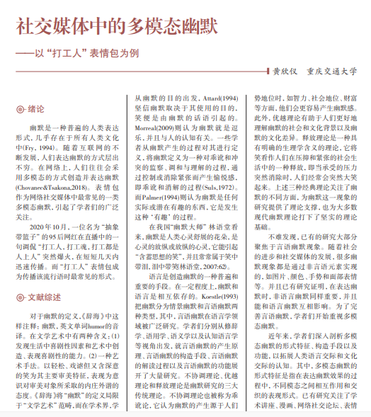 幽默是一种普遍的人类表达 形式,几乎存在于所有人类文化 中(Fry,1994)。 随 着 互 联 网 的 不 断发展,人们表达幽默的方式层出 不穷。在网络上,人们往往会采 用多模态的方式创造并表达幽默 (Chovanec&Tsakona,2018)。 表 情 包 作为网络社交媒体中最常见的一类 多模态幽默,引起了学者们的广泛 关注。
