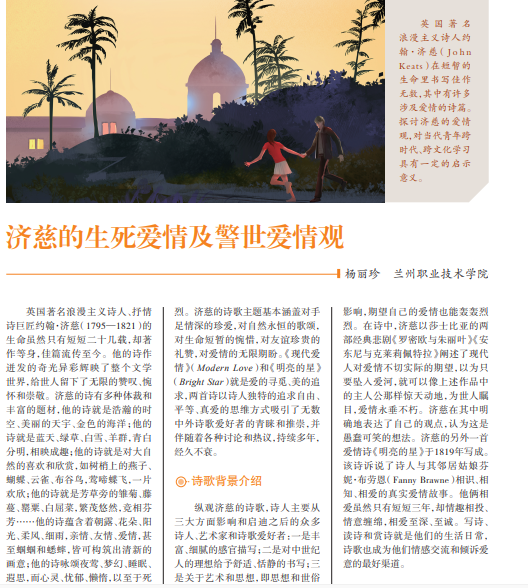 英国著名 浪漫主义诗人约 翰·济 慈( J o h n Keat s)在短暂的 生命里书写佳作 无数,其中有许多 涉及爱情的诗篇。 探讨济慈的爱情 观,对当代青年跨 时代、跨文化学习 具有一定的启示 意义。
