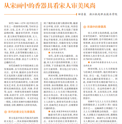 两宋时期的香文化兴盛,随之而来的是香器具的日常化。除了出土与传 世的香器具实物外,如今在两宋时期的绘画中,也时常可以看见香器具的身 影。香器具作为一种重要的实用器物,与宋代的社会文化、艺术密切相关,也 能在其使用场景中看到宋人的生活与宋人的审美风尚。