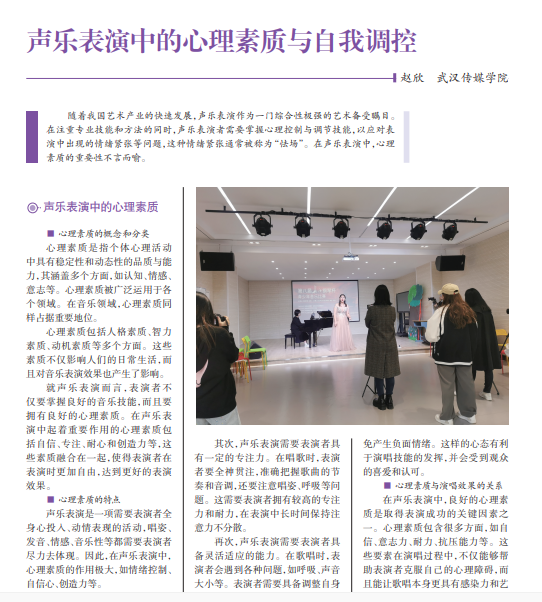 随着我国艺术产业的快速发展,声乐表演作为一门综合性极强的艺术备受瞩目。 在注重专业技能和方法的同时,声乐表演者需要掌握心理控制与调节技能,以应对表 演中出现的情绪紧张等问题,这种情绪紧张通常被称为“怯场”。在声乐表演中,心理 素质的重要性不言而喻。