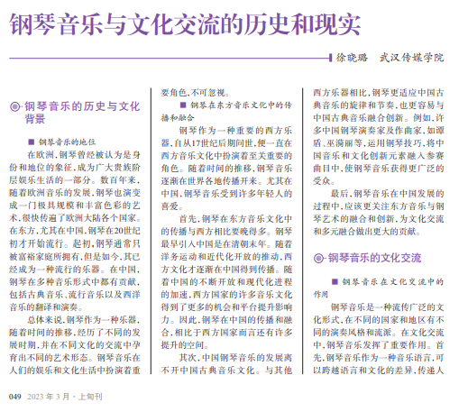 钢琴音乐作为西洋文化的 代表之一,于19世纪传入中国,具 有深刻的历史和文化背景。随着 时代的变迁和全球化的加速,钢 琴音乐成为文化交流中的重要元 素。钢琴音乐与东方音乐文化的 交流与融合,是一项具有深远意 义的文化事业,需要不断进行探 讨和实践,在创新和发展中传承 经典艺术之美。