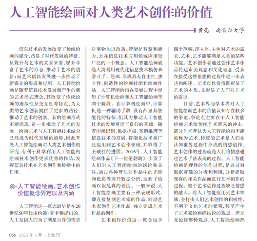 信息技术的发展拓展了绘画 的媒介,人工智能技术被广泛应 用于绘画创作过程中,改变了传 统手工绘画方式,满足了人们对 绘画的需求,在一定程度上促进 了人类艺术思维价值和审美价值 的提升。然而,人工智能绘画也 给人类艺术创作带来了一定的挑 战,人类过于依赖信息技术会导 致艺术创作风格不突出,甚至出 现伦理方面的问题。