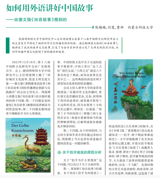 德国明斯特大学中国研究中心主任周俊博士在第十八届中国跨文化研究年会上 的主旨发言中讲述了她的对外文化传播实践和经验。通过翻译德文版的《知音故事》, 她讲述了武汉的城市文化故事,引发了与会专家和学者以及广大师生的热烈讨论,为 对外传播中国文化提供了新的路径和视角。