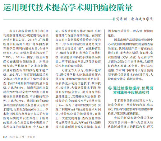 学术期刊的编校质量是 作者、编辑、出版管理部门共 同要面对的问题,一直困扰着 出版界。在现代信息技术高 速发展的今天,编辑可以通过 检索数据库、使用搜索引擎等 手段辅助校对,使用专业校对 工具帮助校对,广泛应用人工 智能成果提高编校质量。虽 然目前各种手段都不够成熟, 人工校对依然是校对的主要 手段,但未来这些手段的综合 运用一定是提高学术期刊编 校质量的最大助力。