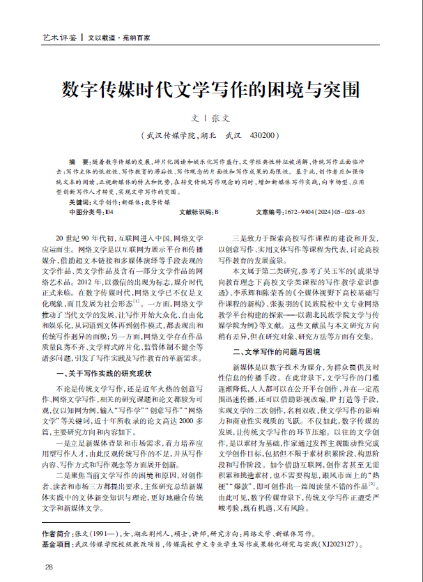 随着数字传媒的发展,碎片化阅读和娱乐化写作盛行,文学经典性特征被消解,传统写作正面临冲