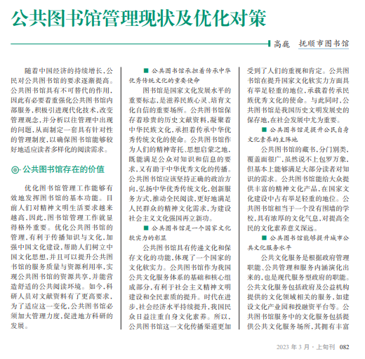 公共图书馆是社会精神文明建设 的重要组成部分。公共图书馆主要是 通过多种途径为大众提供服务,其中最 常见的就是借助网络平台开展各种形 式的服务工作。在信息技术不断发展 的今天,网络技术得到了广泛推广。但 是,目前公共图书馆的管理工作中存在 服务意识不强、管理方法陈旧、管理人 员素质欠缺、管理制度不够严明等问 题,传统的管理模式已经不能满足现代 社会的发展要求。因此,公共图书馆必 须采取措施,优化管理策略。