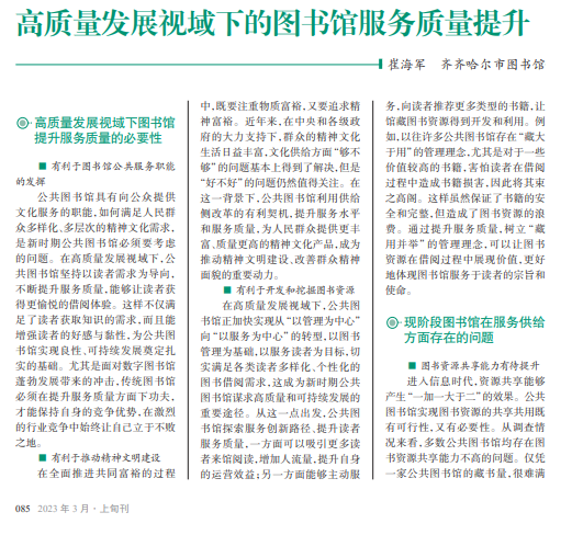 新时期,我国文化事业发展机 遇与挑战并存,公共图书馆作为社 会主义公共文化服务体系的重要 组成部分,必须通过丰富馆藏资源、 完善基础设施、提升服务质量等举 措,更好地发挥自身对社会主义文 化事业的推动作用。纵向来看,近 几年,公共图书馆无论是在服务内 容、服务效率还是服务质量上,均有 明显提升;从横向来看,公共图书 馆与其他类型图书馆相比,服务水 平仍然有较大的提升空间。