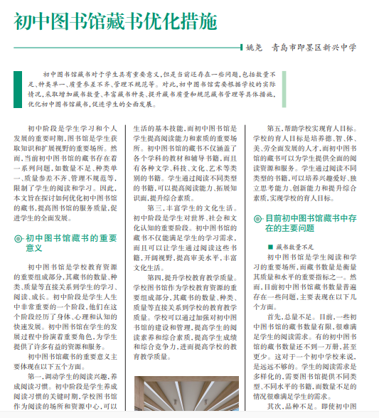 初中图书馆藏书对于学生具有重要意义,但是当前还存在一些问题,包括数量不 足、种类单一、质量参差不齐、管理不规范等。对此,初中图书馆需要根据学校的实际 情况,采取增加藏书数量、丰富藏书种类、提升藏书质量和规范藏书管理等具体措施, 优化初中图书馆藏书,促进学生的全面发展。