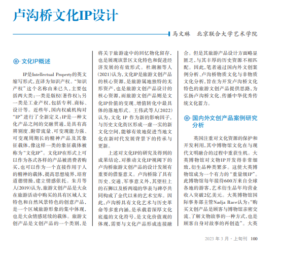 旅游文创产品是文化的载 体,在某种意义上也是一种文化 产品。随着时代的高速发展、经 济水平的不断提升和我国社会 主要矛盾的转变,旅游成为人们 满足美好生活需要和精神需求 的重要途径。卢沟桥是一座历 史的桥、艺术的桥,也是一座英 雄的桥,对于发展文化旅游和开 发旅游文创产品方面有着丰厚 的历史文化资源。将文化资源 与旅游业结合形成独特的文化 IP,是提升卢沟桥文化旅游区核 心竞争力的关键。