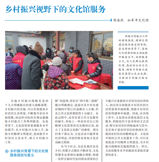 伴随乡村振兴工作 的持续推进,精神文明 建设越来越受到重视。 在这样的背景下,各级 文化馆要积极主动地提 升服务水平,创新服务 方式,为人民群众提供 优质、高效的公共文化 服务,确保乡村振兴政 策优势得以充分发挥, 为推动乡村振兴做出 贡献。