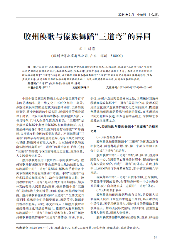 “三道弯”是我国民族民间舞蹈中常见且独特的舞姿形态,不同地区、民族的“三道弯”的产生背景和历史渊源存在明显的差异,其在体态动态、节奏旋律、步伐身形等方面都存在较大差异。本文系统分析胶州秧歌和傣族舞蹈中“三道弯”的异同,以了解胶州秧歌和傣族舞蹈中“三道弯”的诞生与发展脉络及其舞姿形态、节奏步伐的差异,在突出胶州秧歌和傣族舞蹈风格的基础上,为民族民间舞蹈的传承、创新与发展提供参考。