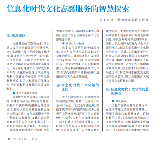 文化服务信息平台 的内容应该具有新颖有 趣、全面真实的特点,既 要保证文化信息的时效 性,又要保证常态化服 务,开设服务项目,由专 门部门负责管理,以满足 群众的文化信息需求。 文化馆在文化志愿服务 活动中,要以时代发展为 核心内容,紧扣时代主 题,加强人员管理和质量 管理,进行智慧化探索。
