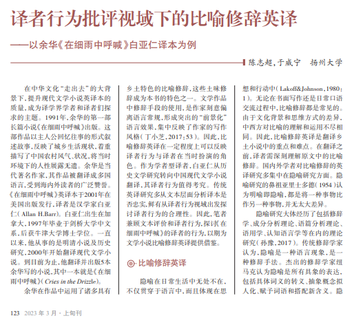 现代文学是中 华文化的重要组成 部分,运用比喻修辞 是其显著特征之一。 比喻修辞方法可以 凸显作者的写作风 格。汉学家白亚仁 在翻译余华小说《在 细雨中呼喊》时,保 留了大量明喻,“求 真为本”;转换和删 改部分明喻,“务实为 用”,体现出鲜明的 译者行为。