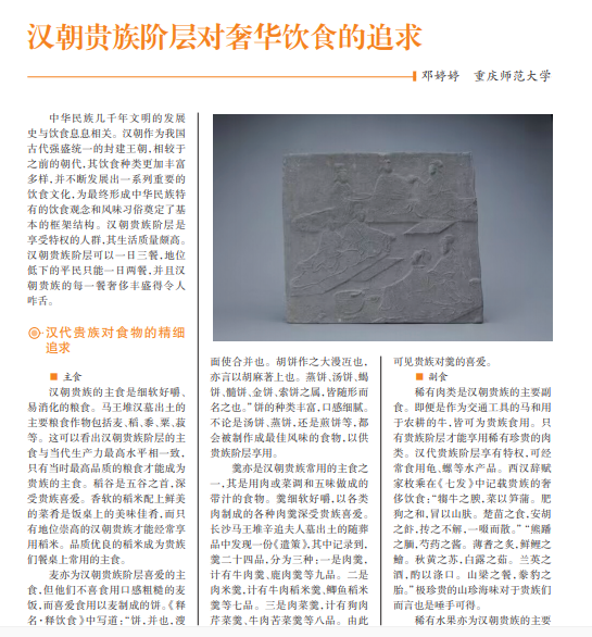 子曰:“饮食男女,人之大欲存焉。”这在一定程度上表明了饮食对人们的重 要性。处于上层阶级的汉朝贵族阶层对饮食有着高品质要求,从精细的主食和 副食,到名贵的饮品,再到奢侈的调味品。汉朝贵族阶层对奢华饮食的极致追求 是其尊贵身份的体现。汉朝贵族的饮食生活能让后代世人从中回顾曾经那个泱 泱大国的灿烂辉煌。