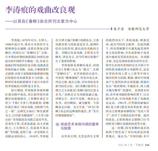 本文立足于20世纪 初《春柳》杂志的刊载内 容,提炼概括其主编李涛 痕戏曲改良观的主要内 容,即旧戏艺术本体内涵 的重审与探索、中国观众 要养成“文明观戏”之习 惯、戏曲演员修养亟需提 高、中国戏曲要走向世界 四个方面,探讨其主要意 义与价值,尤其关注其对 20世纪初期戏曲改良运 动的贡献。