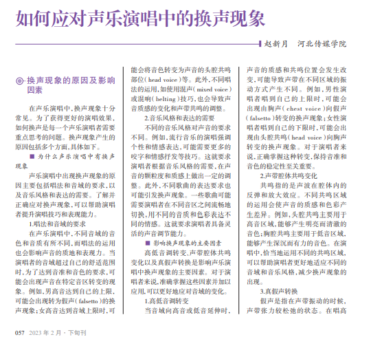 换声现象指的是演 唱过程中声音的转变和 变化,其对演唱者来说非 常重要,对演唱者的音 色、音质、技巧以及自信 心和表现力都会产生一 定影响,是许多演唱者面 临的一个挑战。对于演 唱者来说,了解换声现象 的原因、问题和应对之 策,可以帮助其更好地适 应和发展自己的声音特 点,提高演唱表现力。