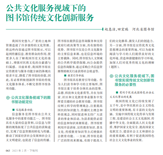 我国优秀传统文 化,是中华民族精神 继承与发扬的坚实基 础。图书馆作为公共 文化服务体系的重要 组成部分,在保障国 民基本文化权益的基 础上提供社会公共服 务。图书馆在传统文 化教育服务开展方面 发挥着重要作用,成 为公共文化教育服务 项目的重要部分。