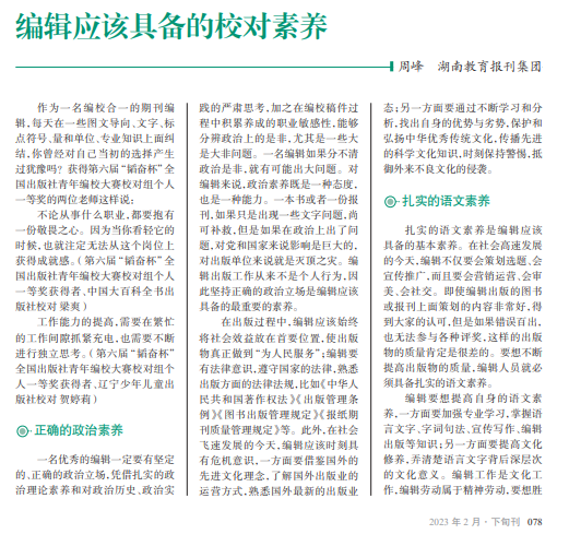 从事任何工作都需要从 业人员具备一定的职业素养, 出版工作自然也不例外。笔 者认为,无论是图书编辑、期 刊编辑、报纸编辑,还是电子 出版物编辑,都必须具备扎实 的校对素养,包括正确的政 治素养、扎实的语文素养、深 厚的专业修养和有效的校对 技术。