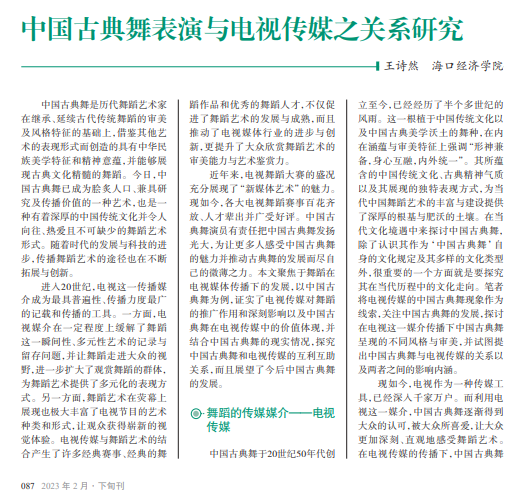 中国古典舞是中国 传统文化的结晶,具有源 远流长的历史,是中华民 族血脉相通、灵魂相融的 艺术形式,具有广泛的群 众基础和雄厚的发展潜 力。而电视传媒的出现, 打破了舞台表演和纸媒 传播的局限性,体现出较 强的及时性和保留性,对 扩大中国古典舞受众范 围、培养演员、提高艺术 水平有重要作用。