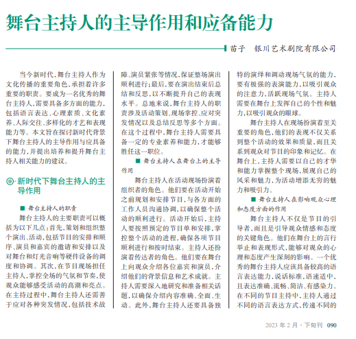 舞台主持人不仅是舞台节目 的重要组成部分,而且决定着舞台 节目的整体效果。新时代背景下, 舞台主持人在舞台节目中发挥着 主导作用,影响观众心理和态度。 因此,舞台主持人应具备语言表达 能力、心理素质和情绪控制能力、 文化素养和知识储备、人际交往和 沟通能力、多样化的才艺和表现能 力等。新时代的舞台主持人必须 注重相关理论知识和技能的学习、 实践中的经验积累和反思、参与培 训和讲座、借鉴他人的成功经验 等,提升自身的能力和素质。