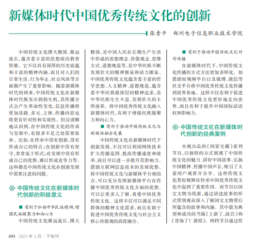 党的二十大报告指出:“增强中 华文明传播力影响力,坚守中华文化 立场……讲好中国故事、传播好中 国声音,展现可信、可爱、可敬的中国 形象……推动中华文化更好走向世 界。”这是新时代对中国传统文化创 新提出的新要求、新目标和新任务。 随着互联网技术的迅猛发展以及手 机、电视等移动终端的普及,中国传 统文化在新媒体时代得到了蓬勃发 展。在这一背景下,如何发挥中国传 统文化的价值和作用成为当前亟待 解决的问题。