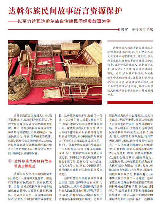 达斡尔族民间故事语言资源既是 达斡尔族文化的核心,也是中华民族 文化宝库中的璀璨瑰宝。现阶段,在达 斡尔族民间经典故事语言资源保护过 程中,出现传承后继乏人、保护力度不 足、媒体宣传力欠佳、保护意识模糊等 困境。对此,应积极采取措施,如健全 语言资源保护体系、凝聚语言资源保 护的社会力量、丰富媒体宣传形式、树 立语言资源保护意识等,助推达斡尔 族民间故事语言资源保护工作的顺利开展。