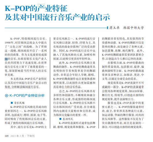 本文重点分析了K-POP 的音乐风格、表演形式、练习 生选拔及培养以及营销与推 广等方面,探讨了K-POP对 中国流行音乐产业的启示,包 括作品风格、舞台表现、人才 培养和媒介传播等方面。结 论认为,K-POP的成功离不 开娱乐公司的精心策划和人 才培养,同时得益于其独特的 音乐风格和表演形式,而中国 流行音乐产业要想更快地发 展,应该注重人才培养和创 新,需要加强营销和推广。