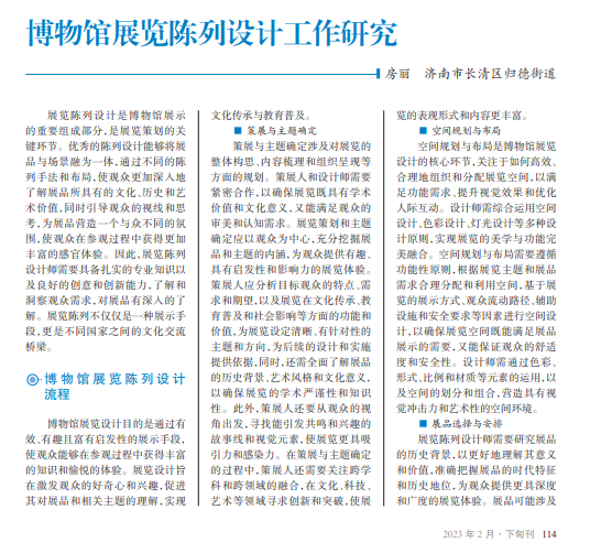 展览设计作为视觉 艺术和空间规划的综合 体现,旨在为观众创造一 个具有美学价值、功能性 和人文关怀的展览空间。 随着社会的发展和技术 的进步,展览设计已经 不再局限于传统的展示 和装置手段,而是融合了 多种创新理念、技术应用 和设计方法,以实现更高 层次的观展体验和社会 效益。