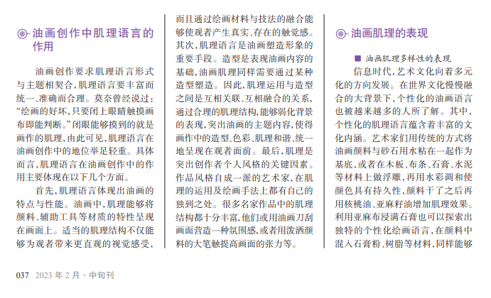 在油画创作过程中,颜料、辅助工具等会在画面上形成独特的组织结构及立体纹 理。这种表现手段即为油画的肌理,肌理使得油画作品具有状物传情的特点,是一种 独特的视觉语言。作为艺术家重要的造型语言,肌理是自然力的产物,其能够表现出 画面的天然之美。不同材料、不同形式的肌理能够产生丰富的表意形态及画面效果, 丰富观者的视觉感受,使其获得“天人合一”的情感满足。因此,研究油画创作中肌理 语言的应用与表现方法具有重要意义。