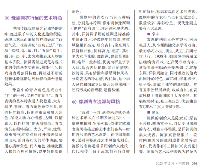 中国戏曲种类丰富,作为中国五大 戏曲之一的豫剧起源于明朝中后期,包 含吹腔、河北梆子腔、昆腔等多种声腔。 青衣是戏曲中的重要行当之一,是戏曲 中旦角的分支,因所扮演的角色常穿青 色衣裙而得名。豫剧中,青衣代表庄重 娴雅的女性角色,青衣人物形象需要演 员具有扎实的功底和塑造形态美的能 力。因传统戏曲的表现形式与现实生 活存在一定联系,故现代豫剧青衣表演 经过老一辈表演大师的传承与革新,逐 渐形成了与时代精神发展相统一、与观 众审美情感和谐共鸣的演创风格。