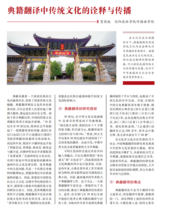 在文化交流与碰撞 的当下,典籍翻译是促进 传统文化内在诠释及对 外传播的重要媒介。典籍 是民族历史文化的沉淀, 因此通过翻译和解读典 籍,可以推进我国传统文 化的传播与发展,这对于 中华典籍的文化自信重 现具有重要意义。