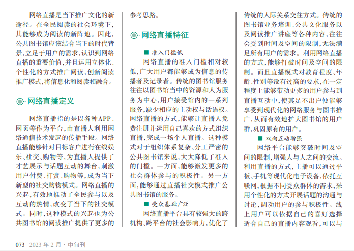 随着科学技术 的不断发展,网络信 息技术越来越发达。 当下,网络直播是一 种较火的信息传播形 式。人们可以通过直 播的方式推广各种产 品,使直播成为新型 的销售模式。在这样 的社会背景下,如何 结合网络直播的模式 推广阅读,成为当下 图书馆人需要思考的 话题。