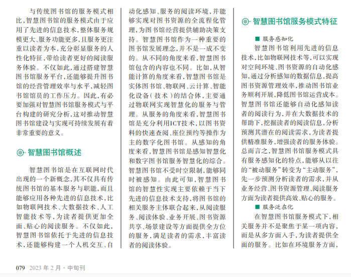 与传统图书馆的服务模式相 比,智慧图书馆的服务模式由于应 用了先进的信息技术,整体服务规 模更大、服务功能更多,且服务更注 重以读者为本,充分彰显服务的人 性化特征,带给读者更好的阅读服 务体验。不仅如此,通过搭建智慧 图书馆服务平台,还能够提升图书 馆的经营管理效率与水平,减轻图 书馆馆员的工作压力。因此,有必 要加强对智慧图书馆服务模式与平 台构建的研究分析,这对推动智慧 图书馆建设与实现可持续发展有着 非常重要的意义。