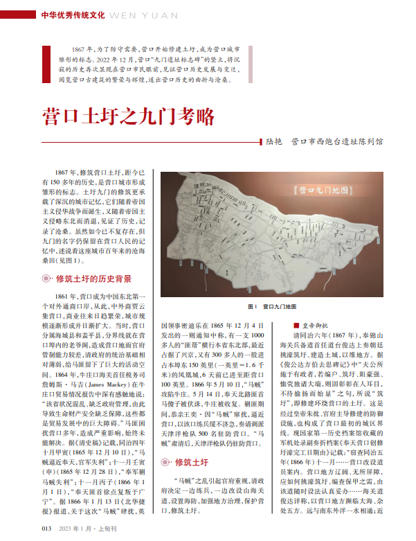 1867年,为了防守需要,营口开始修建土圩,成为营口城市 雏形的标志。2022年 12月,营口“九门遗址标志碑”的竖立,将沉 寂的历史再次显现在营口市民眼前,见证营口历史发展与变迁, 阅览营口古建筑的繁荣与辉煌,道出营口历史的曲折与沧桑。