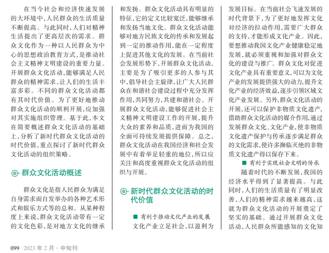 随着我国经济水平的不断提 高和人民生活水平的日益改善,群 众文化已经成为促进经济社会和 谐稳定发展不可或缺的因素。作 为公共文化服务体系的重要组成 部分,群众文化活动在充实人民群 众精神生活、提升民众文化素质等 方面具有积极作用。群众文化活 动有很强的社会功能与时代价值, 在促进社会发展、推进社会主义精 神文明建设的进程中,发挥着不可 取代地重要作用。