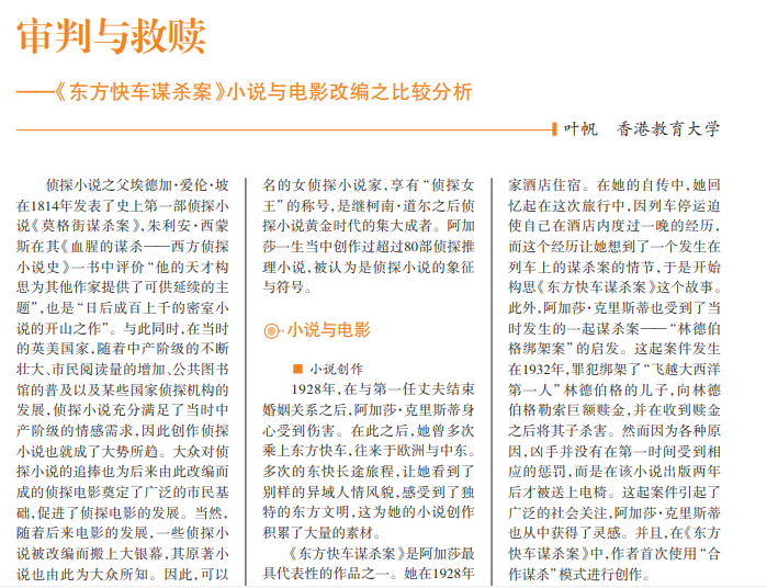 1814年,侦探小说之父 埃德加·爱伦·坡发表史上 第一部侦探小说以来,侦探 小说逐步受到市民阶层追 捧。《东方快车谋杀案》作为 “侦探女王”阿加莎·克里斯 蒂最具代表性的作品之一, 由真实事件“林德伯格绑架 案”改编而来,之后又多次 被改编为电影被搬上大荧 幕。本文选取该小说文本及 其电影版作为讨论对象,围 绕“审判与救赎”这一主题, 分析其小说与电影。