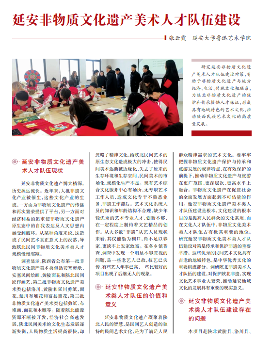 研究延安非物质文化遗 产美术人才队伍建设对策,有 助于非物质文化遗产与地方 经济、生活、传统文化相联系, 为陕北非物质文化遗产的保 护和传承提供人才保证,形成 具有地域特色的艺术文化,推 动陕西民族艺术文化的高质 量发展。